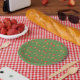 Brown mushrooms, pattern paper plates with cool pumpkin art drawing, custom background.