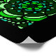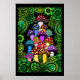 A poster with colorful psychedelic mushrooms surrounded by green paisley and green mandalas.