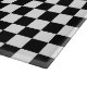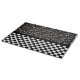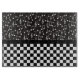 Fun retro look cutting board has a '50s diner jukebox vibe with the top panel of jumbled white musical notes on black background and a black and white checkerboard pattern bottom half.