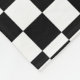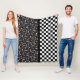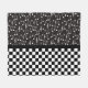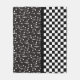 Fun fleece blanket design has a '50s diner jukebox vibe with the top panel of jumbled white musical notes on black background and a black and white checkerboard pattern bottom half.