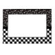 Fun magnetic frame design has a '50s diner jukebox vibe with the top panel of jumbled white musical notes on black background and a black and white checkerboard pattern bottom half.