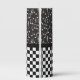 Stylish candle design has a '50s diner vibe with the top panel of jumbled white musical notes on black background and a black and white checkerboard pattern bottom half.
