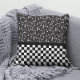 Fun throw pillow design has a '50s diner vibe with the top panel of jumbled white musical notes on black background and a black and white checkerboard pattern bottom half.