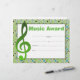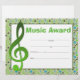 Music Award Certificate for music teachers and band directors. Make your student proud of their accomplishments with an attractive certificate! The "Music Award" text can be changed. The four lines state "presented to", "for" , "on this day the" blank "of" blank, and "signed".