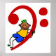 Cute cartoon whimsical illustration of a happy little stick figure boy sitting on a giant musical bass clef symbol. Easily customize and choose your own background colour or add text. Image available on various gifts and products.