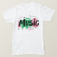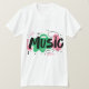 This playful and energetic t-shirt features the word "MUSIC" in bold, hand-lettered style. The design is surrounded by a vibrant mix of abstract shapes, musical symbols, and doodles, creating a fun and dynamic atmosphere. The overall vibe is youthful and expressive, making it perfect for music lovers and anyone who appreciates a touch of creativity.