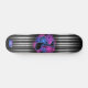 A skateboard with a colorful music note and records (or maybe sound waves?) on a black and white striped background.