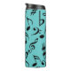 Fun array of black musical notes on a thermal with lid - great for musicians, music teachers, and music lovers on the go! Background color is editable using the design tool. Shown is robin's egg blue / turquoise with black music notes. Designed by Heard_.