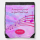 Stylish CHRISTIAN QUOTE DRAWSTRING BAG with musical staves against a cloudy pink background. The inspirational quote says RAISE YOUR PRAISE TO GOD MOST HIGH which is loosely based on Psalm 150 - LET EVERYTHING THAT HAS BREATH PRAISE THE LORD. At the bottom, there is a CUSTOMIZABLE BIBLE VERSE which you can replace with your name, your initials or other text of choice. This would make an ideal gift for singers, worshippers, Back To School, Keep Fit Gym Visits, Christmas and Birthdays.