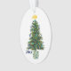 Sharps and flats, clefs, rests, markings for dynamics and articulation: these and other music symbols, in shades of blue, aqua, green, and teal, adorn the elegant Christmas tree seen on both sides of this ornament. An elaborately embellished tree stand and a golden peak made of fanned-out notes complete the image, which is on a simple white background to heighten the contrast. The year that is shown can be altered or removed according to preference. Either way, this item will prove to be an evocative keepsake for any music-loving household or organization.