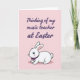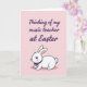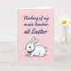 Designed with a soft spring look, this digital illustration pairs a short message with a sweet bunny character 🐰. Near the top, the text reads “Thinking of my music teacher at Easter” in flowing purple lettering that feels like a gentle note of appreciation. The words sit centered across the upper area, leaving airy space around them so the message stands out without crowding the scene. Below, a rounded white bunny with long upright ears gazes forward with big blue eyes and rosy cheeks, giving the impression of a shy, friendly hello 🐇. A small purple bow tie at its neck echoes the text color, like a quiet nod between the note above and the character below. The bunny sits on a faint light-pink shadow that adds a touch of depth against the pastel pink background. The overall setting stays simple with blush pinks and purples, and the bunny’s fluffy tail is tucked to one side while the bow tie sits neatly at the center of its chest.