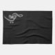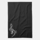 A simple black/white music themed kitchen towel - white treble and bass clefs against a textured black background.
