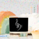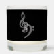 A classy simple black/white music themed scented jar candle - white treble and bass clefs against a textured black background. Music Love.