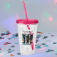 This acrylic drink tumbler with straw and lid has three musical black cats in colourful clothing of blue, green, and pink playing music instruments while standing on a sheet of black music notes. Customise your text with the template on the front and back.