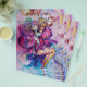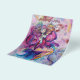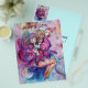 Colorful, whimsical,funny pink clown playing bugle with an expressive owl and joyful musical notes,flowers,leaves in vibrant red,fuchsia,violet,purple,blue,white colors, watercolor painting by Bulgan Lumini (c)