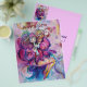 Colorful, whimsical,funny pink clown playing bugle with an expressive owl and joyful musical notes,flowers,leaves in vibrant red,fuchsia,violet,purple,blue,white colors, watercolor painting by Bulgan Lumini (c)