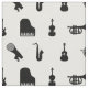 This black and white music pattern fabric design features assorted musical instrument icons, including guitars, a saxophone, trumpet, piano, violin, microphone and drums. Perfect for anyone who loves musical instruments, orchestra, band,
