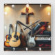 This square wall clock presents a captivating shadow box display of various musical instruments, including acoustic and electric guitars, a violin, and a keyboard. A prominent crucifix is centrally positioned, unifying the collection under a warm, spotlight-illuminated backdrop, celebrating the harmony of music and faith.