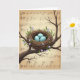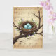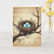 Designed with an intimate nature scene, the card centers on a tightly woven bird’s nest made of earthy brown twigs, holding three smooth, pale blue eggs that sit close together like quiet companions ❤️. Around the nest, fresh green leaves and small lavender blossoms tuck in along the edges, adding a gentle springtime touch that feels like a soft embrace between old friends. The background is an aged, parchment-toned sheet of music, where faded staff lines and muted sepia notes run behind the nest like a hushed melody. Bare brown branches stretch across the composition, framing the nest and crossing over the music lines as if nature is leaning in to meet the written rhythm. Light falls softly from above, brightening the eggs and catching the textures of the twigs while leaving calm shadows that drift across the paper. Any greeting text would sit neatly near the top in a warm brown or deep green, with a smaller line near the bottom in lighter sepia to echo the score 🌼. Subtle branch shadows stripe the musical page, and the pale blue eggs stand out against the tawny paper and dark twigs.