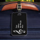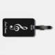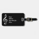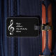 Music note on personalized customizable black luggage tag / travel tag by Heard_, and 369. Treble clef musical note features a tiny white and grey pattern. Lettering shown is white.