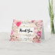 Folded thank you card with a elegant and nostalgic design. Music sheet decorated with a big pink heart and pink roses and wildflowers around the edges.