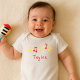 Celebrate your little one’s rhythm from the very beginning with this adorable custom-name baby bodysuit, featuring bright red and yellow musical notes dancing across a golden staff.