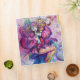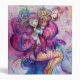 Colorful, whimsical,funny pink clown playing bugle with an expressive owl and joyful musical notes,flowers,leaves in vibrant red,fuchsia,violet,purple,blue,white colors, watercolor painting by Bulgan Lumini (c)
