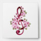 Pink treble clef with delicate, detailed pink Japanese cherry blossoms against white background painted over with light blue paint. Blooming pink sakura.
