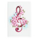 Pink treble clef with delicate, detailed pink Japanese cherry blossoms against white background painted over with light blue paint. Blooming pink sakura.