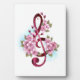 Pink treble clef with delicate, detailed pink Japanese cherry blossoms against white background painted over with light blue paint. Blooming pink sakura.