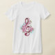 Pink treble clef with delicate, detailed pink Japanese cherry blossoms against white background painted over with light blue paint. Blooming pink sakura.