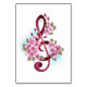 Pink treble clef with delicate, detailed pink Japanese cherry blossoms against white background painted over with light blue paint. Blooming pink sakura.