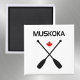 Shows two crossed canoe paddles, a red Canadian maple leaf, and "Muskoka" above. Oars and text are black. Evokes the great Canadian outdoors.
