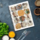 A spiral recipe notebook featuring a photo collage of eleven square photos inside frames with round corners. Add your name in white on mustard yellow beneath cute kitchen utensils.