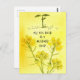 "All you need is a mustard seed" of faith Christian encouragement greeting card decorated with a botanical theme of blooming flowers, a seedling, and tiny seeds on a warm yellow background hand painted with watercolor.