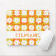 This personalized mouse pad features a retro floral design with white daisies on mustard yellow and orange checkerboard background. Personalize the name.