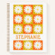 This personalized notebook features a retro floral design with white daisies on mustard yellow and orange checkerboard background. Personalize the name.