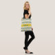 Colorful mustard yellow tulips with stylized blue leaves form a sunny pattern that says "Life" with a capital L. A mustard-colored ribbon in the center of the tote creates space for personalization with a name or saying.