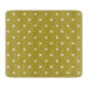 Pattern of white polka dots on a mustard yellow background. The dots are evenly spaced, creating a simple, vintage, playful aesthetic.