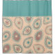 Muted Paisley Shower Curtain. All-over paisley pattern on a beige background with a teal monochromatic polka dot patterned ribbon on the top.