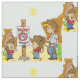 Western theme fabric with cartoon cowboys and cowgirl looking at a mutton bustin rodeo poster