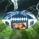 Lightning bolt MVP Dad text with your childrens' picture framed by football helmets all done in blue. Photo Credit: Photography © Storytree Studios, Stanford, CA
