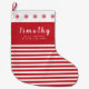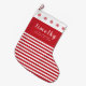 Celebrate your child`s 1st Christmas with a personalized holiday Christmas stocking that can be customized with his or her name plus the year. The white text is set in both a popular sans serif font plus a script font and includes the words `My 1st Christmas`. This design has a cranberry red and white stripe pattern plus cranberry red stars along the top.