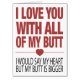 My Butt Funny Valentines Card - Ah Valentines Day that sacred day for lovers all over the world. Celebrate your Valentine with this hilariously honest and quirky card: "I love you will all my Butt. I should say my heart but my butt is bigger" This card will hopefully melt the heart and tickle the funny bone of anyone who receives it. No butts about it.