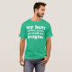 My 11 yo wore adult XL (5’7” 165#). The 8yo is small framed. She wore adult small and tied it in the back. Grandma wore adult large with long sleeve shirt underneath. Tall girl adult medium. Dark haired male adult large. Good quality dark Heather gray, Gildan brand shirt. -it was next up from basic choice and cost about $20 per shirt. Not too thick or thin. Washed and dried well, no major shrinkage. Not see-through. Can wear a bra under it fine. Screen print is just as shown and well done, front and back.