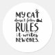 A funny and bold graphic design for cat owners who know their pets are in charge! This typography art features the quote: "My cat doesn't follow rules, it writes new ones." With a cute, stylized cat icon and paw print, it's perfect for t-shirts, mugs, or as wall art to celebrate the playful anarchy of your favorite feline.