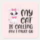Answer the call of feline love with this 'My Cat Is Calling and I Must Go' sticker! Featuring an elegant white cat adorned with a soft pink ribbon, this charming artwork is perfect for cat enthusiasts who know the undeniable pull of their beloved pets. A delightful gift for cat lovers, this design adds a touch of sophistication and humor to your day.