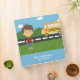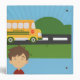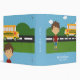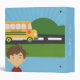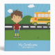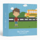 A binder cover featuring a cartoon boy with brown hair in a red shirt, standing by a road with a school bus. Text reads "My Certificates, [Name]." The background includes green grass and a blue sky with clouds. The tone is playful and youthful.