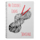 This notebook is designed to keep your notes and ideas for your crochet. It has the words "My crochet ideas" and you can personalise it with your name. The background is light gray with a black and white skein of wool and two red crochet hooks.