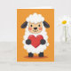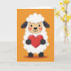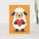 This greeting card shows a cute, cartoon-style sheep centered on a warm orange background. The sheep is bright white with scalloped, cloud-like wool, and it has a cream face with a simple “u”-shaped smile. Its wide black eyes and rosy cheeks give it a friendly, happy look, and its black ears droop slightly to the sides. The sheep stands on short, sturdy legs and holds a shiny red heart in its small black hooves, making the message of love clear. The setting is simple and uncluttered, so your attention stays on the sheep and the heart ❤️